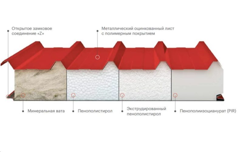 Конструкция представляет собой трехслойный «пирог» из двух защитных металлических облицовок и теплоизоляционного сердечника (внутренний слой, наполнитель). Последний отвечает за основные технические параметры — теплосбережение, шумоизоляцию и огнезащитные свойства.